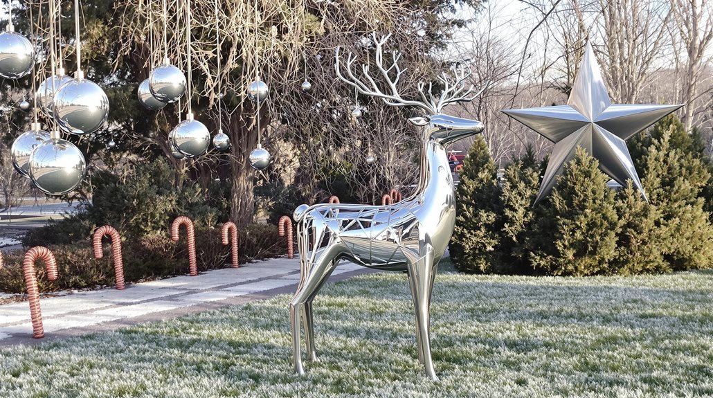 Rustikale Weihnachtsdekorationen verbinden die elegante Einfachheit von Vintage-Metallakzenten mit der organischen Schönheit der Natur. Handgefertigte Ornamente, die handgeschmiedete Teile mit natürlichen Materialien wie Tannenzweigen und Kiefernzapfen kombinieren, schaffen eine harmonische Außendekoration. Vintage-Metallschilder mit nostalgischen Botschaften fügen Charakter hinzu, während Kupferglocken-Installationen visuelles Interesse wecken und sanfte Musiknoten erzeugen. Die Kombination verschiedener Metalltexturen und Patinas trägt zu einer vollständigen verwitterten Ästhetik bei und stellt sicher, dass der Garten sowohl den Geist der Jahreszeit als auch die Natur reflektiert.